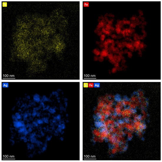 The elemental composition of the obtained (Fe3O4@Ag)@SiO2 nanomaterial was analyzed using energy dispersive X-ray spectroscopy (EDS), and the example EDS maps showing the distributions of various elements are shown in Figure 3.