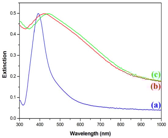 UV–vis extinction spectra of the sols of: (a) the Ag nanoparticles, (b) the Fe3O4@Ag nanocomposite before being covered with silica, and (c) the Fe3O4@Ag nanocomposite after being covered with a silica layer. The measurements were carried out using a standard rectangular 3.5 mL cuvette with an optical path of 1 cm.