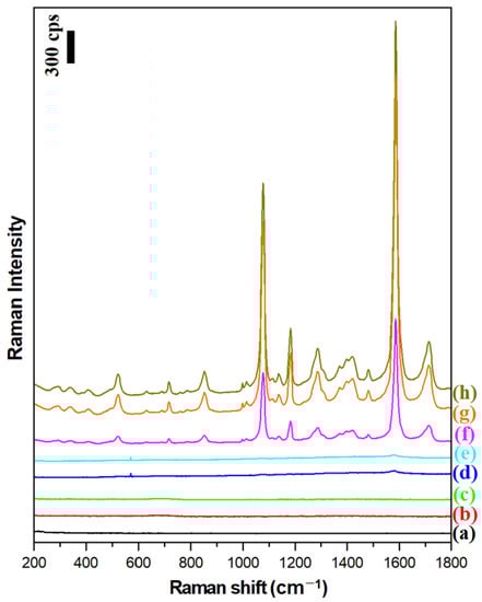 Raman spectra of: (a) the Pt/p-MBA monolayer before the deposition of the magnetic–plasmonic nanoresonators, (b) the Fe3O4@Ag nanoparticles deposited on the flame-annealed platinum plate, (c) the (Fe3O4@Ag)@SiO2 nanoparticles deposited on the flame-annealed platinum plate, (d) the Pt/p-MBA monolayer covered with Fe3O4@Au nanoparticles, (e) the Pt/p-MBA monolayer covered with (Fe3O4@Au)@SiO2 nanoparticles, (f) the Pt/p-MBA monolayer covered with Ag nanoparticles, (g) the Pt/p-MBA monolayer covered with (Fe3O4@Ag)@SiO2 nanoparticles, and (h) the Pt/p-MBA monolayer covered with Fe3O4@Ag nanoparticles. The wavelength of the excitation radiation: 532 nm. The power of the laser beam on the laser head: 70 mW. The accumulation time for a single Raman spectrum: 10 s.