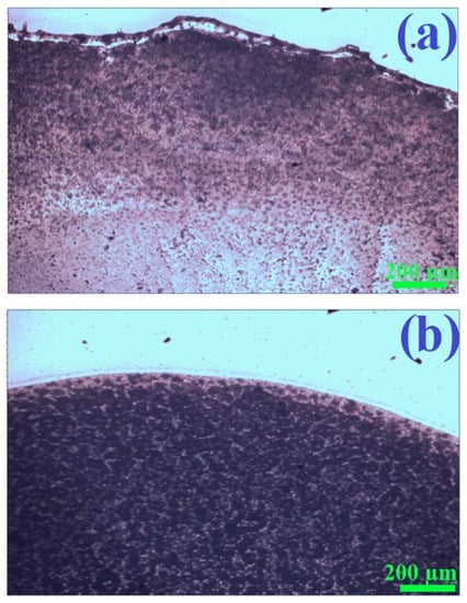 Photographs of fragments of films of (Fe3O4@Ag)@SiO2 nanoparticles on a glass substrate obtained by drying a drop of the sol of (Fe3O4@Ag)@SiO2 nanoparticles: (a) without applying a strong external magnetic field, and (b) when the sample was placed in a strong external magnetic field. For the photographs presented, brightness correction was performed automatically—the physical sense is related only to the differences in the brightness of different areas of the photo. Images obtained using an Olympus BX40 microscope with a 4× objective.