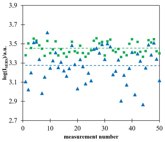 As already reported in some previous publications, the intensity of the Raman spectrum recorded in a single measurement using a more homogeneously deposited layer of magnetic–plasmonic nanostructures is significantly more reproducible [,]. Figure 7 shows a logarithm of the intensity of the strongest Raman band at 1587 cm−1 in 50 subsequently measured Raman spectra of a Pt/p-MBA monolayer covered with (Fe3O4@Ag)@SiO2 nanoparticles. The measurements were carried out for films of (Fe3O4@Ag)@SiO2 nanoparticles prepared with and without the application of a strong external magnetic field during evaporation of the solvent. As in the case of the previously formed magnetic–plasmonic materials for SHINERS measurements [,], the deviation from the mean value was significantly lower for films prepared when a magnetic field was used during the drying process. It is likely that the main reason for a certain nonreproducibility of the measured intensity of the SERS spectra of p-MBA, observed even in the case of measurements carried out on (Fe3O4@Ag)@SiO2 layers prepared with the application of a strong external magnetic field during evaporation of the solvent, was a partial agglomeration of magnetic–plasmonic structures, the occurrence of which was facilitated by the magnetic properties of the nanomaterial used.