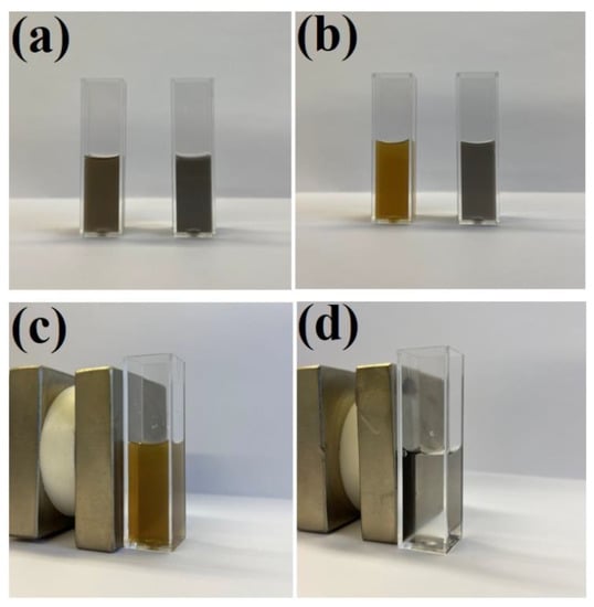 Photographs of sols of: (a) the Fe3O4@Ag (left) and (Fe3O4@Ag)@SiO2 (right) before the addition of hydrochloric acid, (b) the Fe3O4@Ag (left) and (Fe3O4@Ag)@SiO2 (right) one hour after the addition of hydrochloric acid to a final concentration of 0.1 M, (c) the Fe3O4@Ag one hour after the addition of hydrochloric acid—the cuvette with the sol is placed near a strong neodymium magnet—and (d) the (Fe3O4@Ag)@SiO2 one hour after the addition of hydrochloric acid—the cuvette with the sol is placed near a strong neodymium magnet. The cuvette used was a standard square 3.5 mL cuvette with an optical path of 1 cm. The sols were not diluted before the photo was taken.