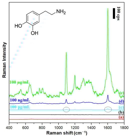 Dopamine (3,4-dihydroxyphenylethylamine) is one of the most important neurotransmitters (from the catecholamine group) in the human body (the inset in Figure 9 shows the structural formula of dopamine). Dopamine operates in the hypothalamus and the pituitary gland, and directly affects a person’s emotions []. Abnormal dopamine levels are associated with neurological disorders such as schizophrenia, Parkinson’s disease, depression, and Huntington’s disease [,]. In this work, we decided to use dopamine as a Raman scatterer to verify whether a silica-covered magnetic–plasmonic SERS substrate could be used to detect dopamine when its concentration in the surrounding liquid was within the range of physiological concentrations.