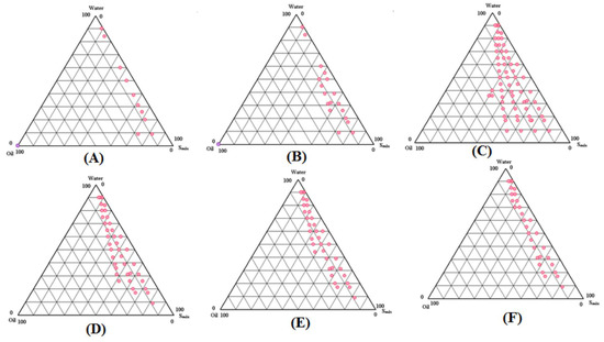 Pseudo-ternary phase diagrams showing SNEDDS zones for oil phase (Lauroglycol-90), aqueous phase (water), surfactant (Tween-80) and cosurfactant (Transcutol-HP) at Smix ratios of (A) 1:0, (B) 1:2, (C) 1:1, (D) 2:1, (E) 3:1, and (F) 4:1.
