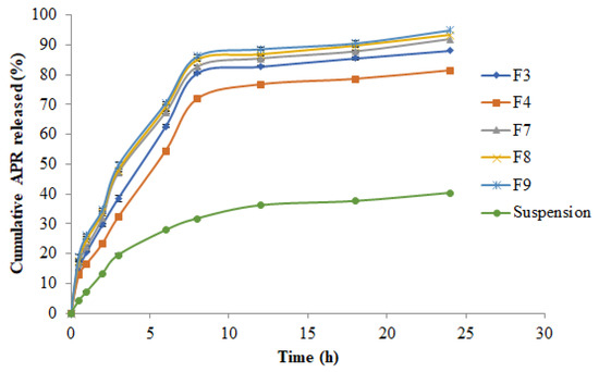 Different kinetic models regarding the mechanism of drug release were studied, including zero-order model, first-order model, Higuchi model, the Hixon–Crowell model and the Korsemeyer–Peppas model [21,22,23]. The correlation coefficients (R2) and kinetic of drug release from APR-SNEDDS (F3, F4, F7, F8 and F9) and APR suspension are shown in Table 5. The different values of R2 indicated the best model fit the drug release pattern from each formulation. The F3 formulation had R2 = 0.999 following zero order release kinetics and Hixon–Crowell kinetics too. The best model fit for F4 was zero order kinetics with R2 = 0.999. For formulations F7, F8 and the optimum formulation F9, the highest R2 values were 0.997, 0.996 and 0.9995, respectively, fitting Hixon–Crowell drug release kinetics. For APR-suspension, the best model fitting its drug release kinetic was the Higuchi model with R2 = 0.996.