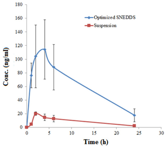 The analysis of APR in male rat plasma samples was performed using a UHPLC-MS/MS method as reported in the literature [24]. The concentration of APR in rat plasma samples was obtained using a calibration curve plotted between the concentration of APR and area ratio of APR to an internal standard (IR). The calibration curve of APR was found to be linear in the concentration range of 1.47–350 ng/mL. Both formulations showed immediate and rapid drug release during the first two hours of the study with the suspension reaching its maximum concentration of 20 ng/mL, but the F9 formulation continued to release drug sharply with a concentration of 103 ng/mL by that time. After two hours, the drug release from the suspension decreased gradually, reaching 0 ng/mL concentration at the end of the study (24 h). APR-optimized SNEDDS continued to increase readily after two hours until the maximum concentration of 119 ng/mL was reached at 5 h. After that, it decreased steeply, reaching 90 ng/mL concentration at 6 h. The next hours showed a gradual decrease in the drug plasma concentration until the end time point was reached (24 h) with a concentration of 22 ng/mL. Overall, the release profile of APR from optimized SNEDDS F9 was significant compared to the drug suspension (p < 0.05). The comparative in vivo APR release after oral administration of optimized SNEDDS and APR suspension are shown in Figure 4.