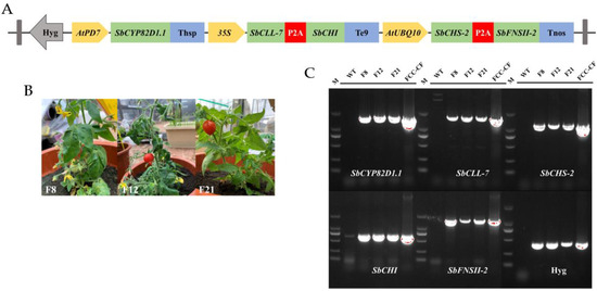 To detect the integration of transgenes in the genome of transgenic tomato plants, the leaves of resistant plant DNA were obtained using a Plant Genomic DNA Kit. This was used as the template. KOD One PCR Master Mix was used to verify the SbCYP82D1.1, SbCLL-7, SbCHS-2, SbCHI, SbFNSII-2 genes and hygromycin resistance gene (Hyg) in the transgenic plants using the specific primers. The recombination vector FCC-CF was a positive control. As the negative control, wild-type (WT) plant DNA was extracted. All of the primers used in PCR detection are shown in Table S2.