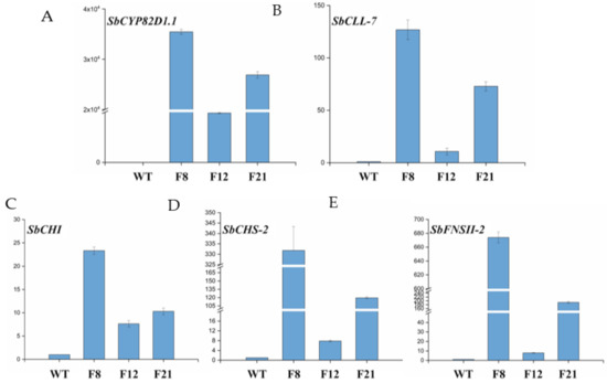 The relative gene-expression-level analysis of candidate genes in the transgenic Micro-Tom tomato plants and WT plants. (A) The relative expression-level analysis of SbCYP82D1.1. (B) The relative expression-level analysis of SbCLL-7. (C) The relative expression-level analysis of SbCHI. (D) The relative expression-level analysis of SbCHS-2. (E) The relative expression-level analysis of SbFNSII-2. WT: wild-type Micro-Tom tomato plants. F8, F12 and F21: transgenic tomato plants. Leactin gene from Lycopersicon esculentum was used as the reference gene. The data are represented as mean ± SD for the three independent experiments.