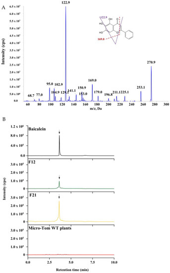 HPLC-MS/MS analysis of baicalein in transgenic Micro-Tom tomato lines. (A) Full-scan product ion spectra and the proposed fragmentation schemes of baicalein. (B) The total ion chromatogram (TIC) of the samples and the control, respectively.