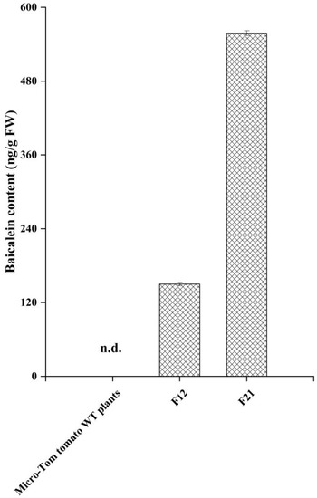 Average baicalein content (ng/g fresh weight) in the fruits of transgenic Micro-Tom tomato lines. n.d.: not detected. The data are represented as mean ± SD for the three independent experiments.