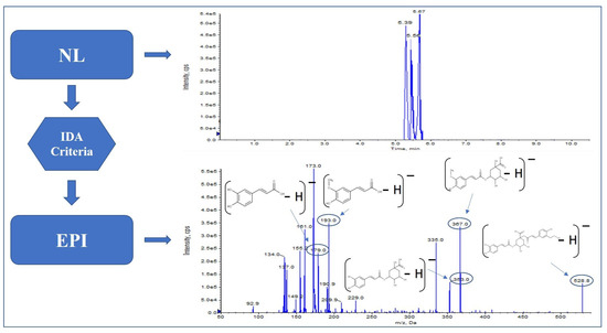 The NL-IDA-EPI acquisition mode was used to identify the numerous conjugated forms of PCs that have common neutral losses, such as the sugar fraction [M-H-Gly]− and the quinic acid esters of hydroxycinnamic acids [M − H − quinoyl]−. Using the IDA criteria, with dynamic subtraction of the background of the survey scan, it was possible to activate the EPI scan and confirm the different analytes in the same LC/MS run.