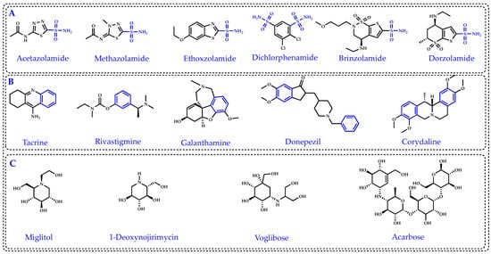 Commonly used standard inhibitors for carbonic anhydrase isoenzyme II (CA II) (A), for acetylcholinesterase (AChE) and butyrylcholinesterase (BChE) (B) and for α-glycosidase (α-Gly) (C).