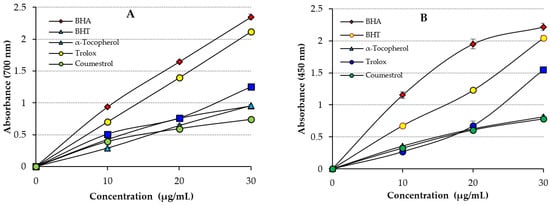 (A) Fe3+-reducing activity of Coumestrol and of standards; (B) Cu2+-reducing activity of Coumestrol and of standards.