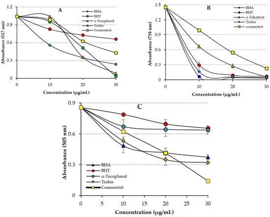 Radical-scavenging activities of Coumestrol and of standard antioxidants: (A) DPPH•-scavenging, (B) ABTS•+-scavenging, and (C) DMPD•+-scavenging effects.