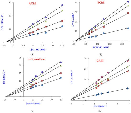 Lineweaver–Burk graphs of Coumestrol against acetylcholinesterase (AChE) (A), butyrylcholinesterase (BChE) (B), α-glycosidase (C), and carbonic anhydrase II (CA II) (D).