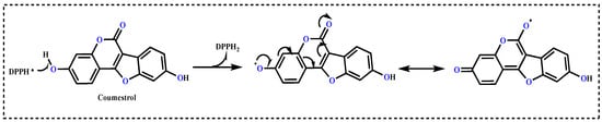 In biological, drug, and food applications, the radical-scavenging abilities of antioxidants has great importance in terms of preventing damage caused by free radicals and ROS to the organism and products [68]. In addition, the used chromophore ABTS•+-, DPPH•- and DMPD•+-scavenging assays are fast, simple, selective, inexpensive, and reproducible. Thus, the examination of these radical-scavenging activities is quite a common method for determining the antioxidant activities of pure substances. The high detection sensitivity of purple DPPH•, pink DMPD•+, and green-blue ABTS•+ radicals makes them very easy to use [66]. In these methods, hydrogen atom of phenolic -OH groups can be easily abstracted by oxygen-centered radicals; the unsaturated region in the lipid chain can also react with Coumestrol, which may act as a chain-breaking radical scavenger. Coumestrol includes two phenolic rings, both of which contain a hydroxyl group (-OH) and a methoxy group (-OCH3) in the ortho-position [69]. The most favorable structural features of antioxidant potential of phenolics are the presence of H-donating substituents and the delocalization capabilities of the free electron, which are necessary for stability. Also, the most active form of an antioxidant molecule is the presence of more than one active -OH group in the ortho-position, which plays a crucial role in SAR in the molecule. It is known that -OH groups in the ortho-position are more active due to their ability to form intramolecular H-bonds [70]. In addition, subordinate groups are more affected by neighboring ortho- and para-positions, respectively. In both positions, bonded groups attract or donate more electrons depending on their electron-withdrawing (such as nitro groups) or electron-accepting (such as methoxy groups) properties [71]. Also, it has been shown that the para-position is more effective than the meta-position in a compound. H atoms that are not included in intramolecular H bonds are then abstracted by free radicals, and in this case, the molecule acquires a more stable structure [72]. It is known that the antioxidant capabilities of phenolics that cause biological activity are related to the position and number of -OH groups in the molecule. Due to these properties, polymeric polyphenols have more antioxidant effects than simple monomeric units [73]. According to the mechanism proposed between Coumestrol and DPPH given in Figure 6, the structure of Coumestrol leads to interference in the DPPH free radicals. Also, it has been reported that the existence of two hydroxyl groups in its chemical structure, with orientation analogous to estradiol, is responsible for its antioxidant capacity and estrogenic activity [27].