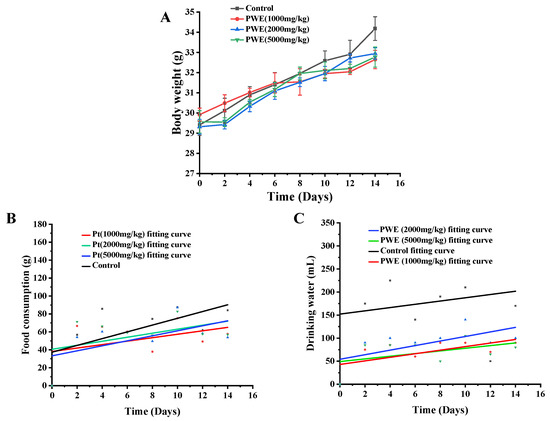 Before an animal experiment, the acute toxicity test should be performed to provide the safety dose of the tested sample. In this study, no mortality and abnormal behavior changes (such as fur changes, slow movements, seizures, paralysis) were observed in the PWE treated mice (5000 mg/kg body weight) during the experiment’s 14 days. The organ index of the same organ in each group had no significant difference (Table 2). As shown in Figure 3A, the weight of mice treated with and without PWE increased in the experiment period, and the water and food consumption also increased (Figure 3B,C). Thus, it is safe for mice at a dose of less than 5000 mg/kg PWE.