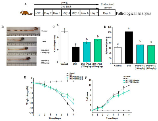 The effects of PWE on improving the symptoms of DSS-induced ulcerative colitis in mice. (A) The experiment design. (B) Representative images of colon tissues. (C) the length of colon tissues in each group (cm). (D) Spleen weight in each group. (E) Body weight changes throughout this experiment. (F) Disease activity index (DAI) score. Data are presented as means ± SE (n = 8). Bars with different letters are significantly different (p < 0.05).
