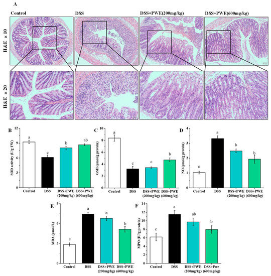 PWE improved intestinal barrier function. H&E-stained images of each group on DSS-induced colon injury in mice (A), and effects of PWE on superoxide dismutase (SOD) (B), glutathione (GSH) (C), myeloperoxidase (MPO) (F) activity, malondialdehyde (MDA) (E), nitric oxide (NO) (D) content in the colon tissue of mice. Data are presented as means ± SE (n = 8). Bars with different letters are significantly different (p < 0.05).