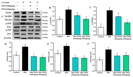PWE inhibited the activation of the nuclear factor-kappa B (NF-κB) signaling pathway in DSS-induced ulcerative colitis mice. (A) Target protein expressions of mice colon. (B) Phosphorylated nuclear factor-kappa B p65 protein/nuclear factor-kappa B p65 protein (p-P65/P65), (C) phosphorylated p38 mitogen/p38 mitogen (p-P38/P38), (D) toll-like receptor 4/β-actin (TLR4/β-actin), (E) myeloid differentiation factor 88/β-actin (MyD88/β-actin), (F) TNF receptor associated factor 6/β-actin (TRAF/β-actin). Data are expressed as the means ± SE (n = 8). Bars with different letters are significantly different (p < 0.05).