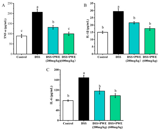 The effects of PWE on the productions of TNF-α (A), IL-1β (B), IL-6 (C) in the different group colon tissues. Data are presented as means ± SE (n = 8). Bars with different letters are significantly different (p < 0.05). IL-1β, interleukin-1 beta; TNF-α, tumor necrosis factor-alpha; IL-1β, interleukin-1 beta.