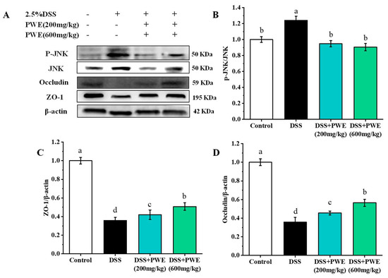 PWE improved the expressions of occludin and ZO-1 by JNK signaling. (A) Target protein expressions in mice colon. (B) Phosphorylated c-Jun N-terminal kinases/c-Jun N-terminal kinases (p-JNK/JNK), (C) zonula occludens-1/β-actin (ZO-1/β-actin), (D) occludin/β-actin. Data are expressed as the means ± SE (n = 8). Bars with different letters are significantly different (p < 0.05).