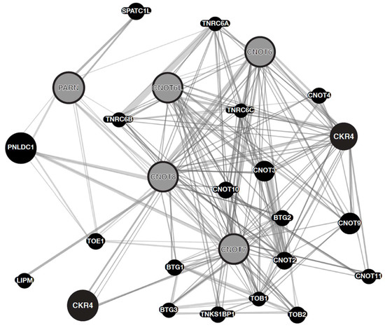 The previous observations on the emerging role of deadenylases in gene expression in cancer highlight the need for the investigation of genetic interplay of key genes in the disease. Similar gene expression patterns [29], the interaction between gene products of known genes [30], and similar phylogenetic profiles [31] are indications of similar functions of these genes. The existing algorithms used for predicting gene function mainly use the guilt-by-association principle. Their application involves adding related genes to a “seed-list” of functionally known genes. These algorithms typically compute a “functional correlation network” to represent each dataset, where each node corresponds to proteins or genes, and the ends are weighted according to co-functionality data. The kernels used by support vector machines (SVMs) [32,33], functional association networks [34], and protein-protein association maps [35] are three types of functional association networks. Individual association networks are often combined to create a complex association network that summarizes all indications of co-functionality. The predictions of these algorithms are quite accurate in the case of non-annotated genes, since using multiple complementary data sources means they are able to accurately predict previously annotated gene functions blind [36]. In the case of the genes in this study, namely, CNOT6, CNOT6L CNOT7, CNOT8, and PARN, the genetic network returns quite intriguing associations.