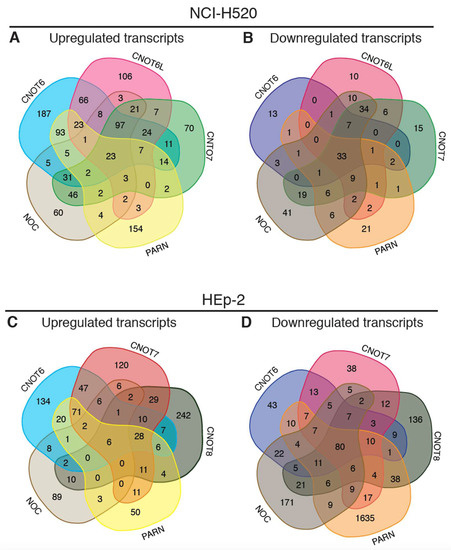 Transcripts affected by each deadenylase in NCI-H520 and HEp-2 cells. (A) Venn diagrams showing upregulated transcripts of CNOT6, CNOT6L, CNOT7, PARN, and NOC KD in NCI-H520 cells. (B) Venn diagrams showing downregulated transcripts of CNOT6, CNOT6L, CNOT7, PARN, and NOC KD in in NCI-H520 cells. (C) Venn diagrams showing upregulated transcripts of CNOT6, CNOT7, CNOT8, PARN, and NOC KD in HEp-2 cells. (D) Venn diagrams showing downregulated transcripts of CNOT6, CNOT7, CNOT8, PARN, and NOC KD in HEp-2 cells. The numbers represent differentially expressed transcripts, the levels of which are altered by FC ≥ 2.0 upon silencing of the indicated deadenylase.