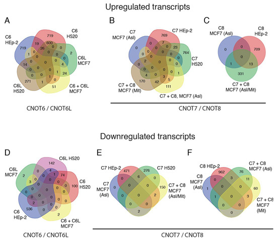Upregulated and downregulated transcripts upon deadenylase silencing in NCI-H520, HEp-2, and MCF7 cells. (A–C) Venn diagrams showing upregulated transcripts after silencing of CNOT6 and CNOT6L, CNOT7 and CNOT8 in NCI-H520, HEp-2, and MCF7 cells. (A) Silencing of CNOT6 and CNOT6L in NCI-H520, HEp-2, and MCF7 cells, and in combination with CNOT6L (C6 + C6L) in MCF7 cells. (B) Silencing of CNOT7 in NCI-H520, HEp-2, and MCF7 cells and in combination with CNOT8 (C7 + C8) in MCF7 cells. (C) Silencing of CNOT8 in HEp-2 and MCF7 cells, and in combination with CNOT7 (C7 + C8) in MCF7 cells. (D–F). Venn diagrams showing downregulated transcripts after silencing of CNOT6, CNOT6L, CNOT7, and CNOT8 in NCI-H520, HEp-2, and MCF7 cells. (D) Silencing of CNOT6 and CNOT6L in NCI-H520, HEp-2, and MCF7 cells, and in combination (C6 + C6L) in MCF7 cells. (E) Silencing of CNOT7 in NCI-H520, HEp-2, and MCF7 cells, and in combination with CNOT8 (C7 + C8) in MCF7 cells. (F) Silencing of CNOT8 in HEp-2 and MCF7 cells, and in combination with CNOT7 (C7 + C8) in MCF7 cells. The numbers represent differentially expressed transcripts, the levels of which are altered by FC ≥ 1.5 upon silencing of the indicated deadenylase. The data for transcripts from MCF7 cells are from the studies of Aslam et al. and Mittal et al. [52,53]. Asl, Aslam; Mit, Mittal; Asl/Mit, Aslam/Mittal, respectively. C6, CNOT6; C6L, CNOT6L; C7, CNOT7; C8, CNOT8.
