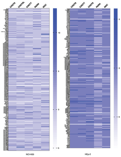 According to the genetic network, we examined the association between CNOT deadenylases and the impact on gene expression in two cell lines of different cancer origin, NCI-H520, of squamous cell lung carcinoma, and HEp-2, originally derived from human epidermoid (Hep) carcinoma of the larynx [42,43]. NCI-H520 (H520) cells were isolated from the lung tissue of a male squamous cell carcinoma patient. Genetic alterations, including the mutation of the epidermal growth factor receptor, or v-Ki-ras2 kirsten rat sarcoma viral oncogene homolog, and the fusion of anaplastic lymphoma kinase (ALK), RET proto-oncogene (RET), or v-ros UR2 sarcoma virus oncogene homolog 1 (ROS1), occur in non-small cell lung cancers [44]. A search conducted in the Expasy database for mutations in NCI-H520 rendered three mutated genes: ATM, CDKN2A, and TP53 (https://web.expasy.org/cellosaurus/CVCL_1566) (accessed on 5 April 2022). We extended our search for mutations in COSMIC (Catalogue Of Somatic Mutations In Cancer; https://cancer.sanger.ac.uk/cosmic (accessed on 10 February 2022) [45]. The search of the COSMIC Cell Line Gene Mutation Profiles dataset rendered at least 445 mutated genes from NCI-H520 cells; https://cancer.sanger.ac.uk/cell_lines/sample/overview?id=908443 (accessed on 10 February 2022) [46]. The sequencing of the p53 cDNA for HEp-2 shows no mutations, while the cells produced HPV 18/E6-inactivated protein [47].