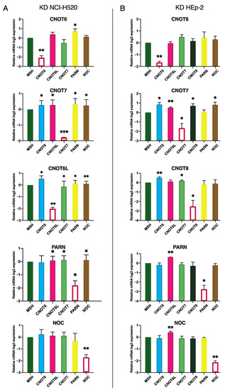 The following are available online at https://www.mdpi.com/article/10.3390/molecules27103102/s1, Table S1: Upregulated and downregulated transcripts upon silencing of CNOT6, CNOT6L, CNOT7, PARN, and NOC in NCI-H520 cells. Table S2: Over-representation analysis of common differentially overexpressed and downregulated transcripts after CNOT6, CNOT6L, and CNOT7 silencing in NCI-H520 cells, Table S3: Upregulated and downregulated transcripts (FC ≥ 2.0) upon silencing of CNOT6, CNOT7, CNOT8, PARN, and NOC in HEp-2cells, Table S4: Over-representation analysis of common differentially overexpressed and downregulated transcripts after CNOT6, CNOT6L, and CNOT7 silencing in HEp-2 cells, Table S5: Common transcripts upon silencing of CNOT6, CNOT6L, CNOT7, PARN, and NOC in NCI-H520, HEp-2, and MCF7 cells (FC ≥ 1.5), Table S6: Upregulated and downregulated non-coding RNAs upon silencing of CNOT6, CNOT6L, CNOT7, PARN, and NOC in NCI-H520 cells (FC ≥ 2.0), Table S7: Upregulated and downregulated non-coding RNAs upon silencing of CNOT6, CNOT7, CNOT8, PARN, and NOC in HEp-2 cells (FC ≥ 2.0), Table S8: Top ten upregulated and downregulated transcripts upon silencing of CNOT6, CNOT7, CNOT8, PARN, and NOC in NCI-H520 and HEp-2 cells.