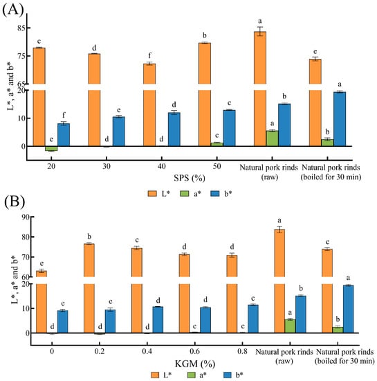 The color parameters of the plant-based pork rinds containing different SPS (A) and KGM (B) concentrations. Different lowercase letters (a–f) in the same color group denote significant differences (p < 0.05).