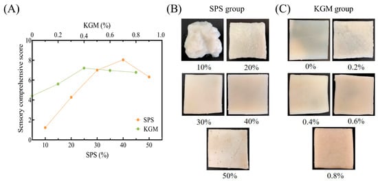 The SCS of the SPS and KGM groups increased initially, followed by a decrease. As shown in Figure 2B, the 10% SPS gels were soft and sticky with a pasty texture, which was difficult to associate with natural pork rinds. The SCS of the samples increased at higher SPS concentrations, peaking at 40% SPS due to improved appearance and texture. Without KGM, the samples were difficult to shape during steaming, while a water film covered the surface, resulting in high viscosity. The addition of KGM reduced the stickiness of the samples, improved the gel strength, and caused the formation of KGM-SPS complexes. As the number of complexes increased, the appearance of plant-based pork rinds became rougher (Figure 2C), presenting a distinct grainy mouthfeel, especially in the 0.6–0.8% KGM samples, which exhibited decreased SCS. Therefore, the 40% SPS and the 0.4% KGM samples were considered the closest to the natural pork rinds in texture, appearance, and mouthfeel.