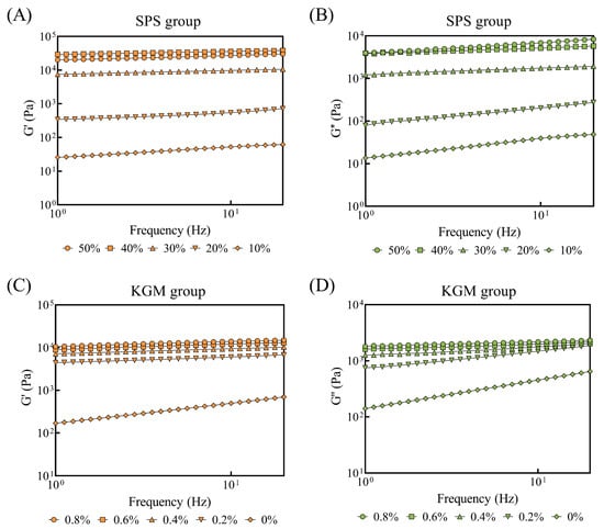 The G’ and G’’ of the plant-based pork rinds (frequency scanning) containing different SPS (A,B) and KGM (C,D) concentrations.