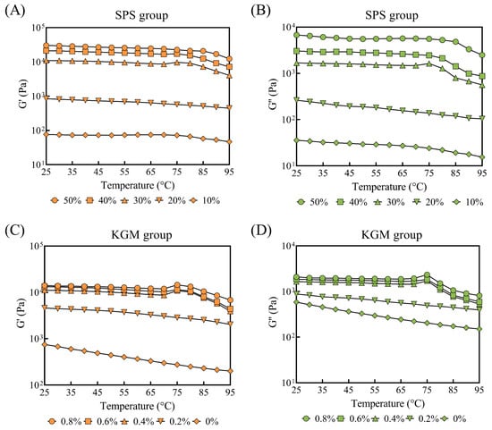 The G’ and G’’ of the plant-based pork rinds (temperature scanning) containing different SPS (A,B) and KGM (C,D) concentrations.