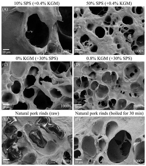 The microstructures of the plant-based pork rinds containing different SPS (A,B) and KGM (C,D) concentrations and natural pork rinds (E,F).