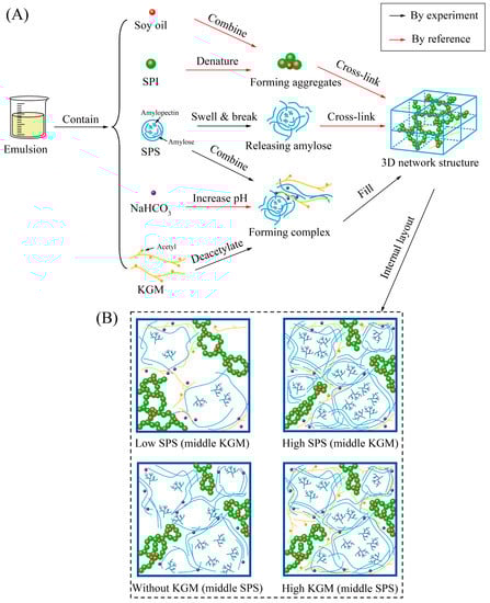A schematic model showing the gelling mechanism (A) and internal layout (B) of the plant-based pork rinds containing different SPS and KGM concentrations.