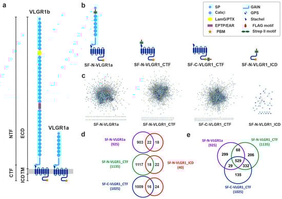 VLGR1 domain structures and VLGR1-associated protein networks. (a) The two long isoforms of VLGR1, the full-length protein VLGR1b, and the shorter isoform VLGR1a can be autocleaved at the GPS (G-protein-coupled receptor proteolytic site) into the following fragments: N-terminal fragment (NTF) and the C-terminal fragment (CTF), which are composed of a short intracellular domain (ICD), the seven transmembrane domain (TM), and the long extracellular domain (ECD). (b) N- or C-terminally Strep II- FLAG (SF)-tagged VLGR1 constructs were used as baits. (c) Protein networks of prey identified with SF-N-VLGR1a (863 out of 925 prey proteins are interconnected, based on the STRING database (https://string-db.org/, accessed on 10 September 2017), SF-N-VLGR1_CTF (1054 out of 1135 prey proteins are interconnected), SF-C-VLGR1_CTF (939 of 1025 prey proteins are interconnected), and SF-N-VLGR1_ICD (29 out of 40 prey proteins are interconnected). (d,e) Venn diagrams of VLGR1 prey revealing overlaps between the interactomes found for the VLGR1 constructs.