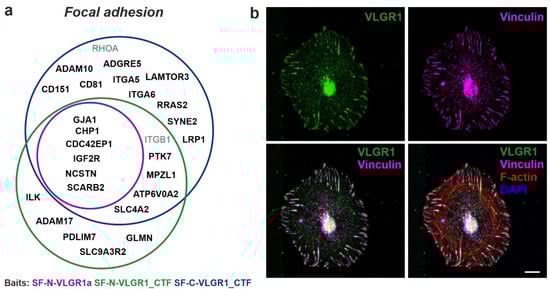 Beside their signaling function, ADGRs possess adhesive properties. In VLGR1 TAPs with HEK293T cell lysates, we identified 96 proteins that are assigned to the GO term focal adhesion, of which 25 have a CRAPome value 20 (Figure 3a). The high number of focal adhesions (FA)-associated prey is consistent with data from RPE1 cells performed in a parallel study [47]. Figure 3b shows the localization of VLGR1 in FAs of primary mouse brain astrocytes, concordant with data of the latter study [47]. FAs are macromolecular assemblies at contact sites of cell membranes with the extracellular matrix (ECM) [48]. There they act as hubs for bidirectional signaling, the ‘‘inside-out’’ transmission of intracellular forces to the ECM, and the ‘‘outside-in’’ signal transmission of shear forces between the cell and the ECM from the environment to the cell interior [49]. While no FA protein was found in the VLGR1_ICD TAPs, the prey for SF-N-VLGR1a, SF-N-VLGR1_CTF, and SF-C-VLGR1_CTF contained several FA core proteins. Being proteins directly associated with integrins, the core FA adhesion molecules were mostly restricted to both VLGR1_CTF TAPs. This suggests that the interaction with integrin complexes depends on the activity level of VLGR1. All in all, these data further support our recent findings that VLGR1 functions as a metabotropic mechanosensor in FAs that is critical for cell spreading and cell migration [47].