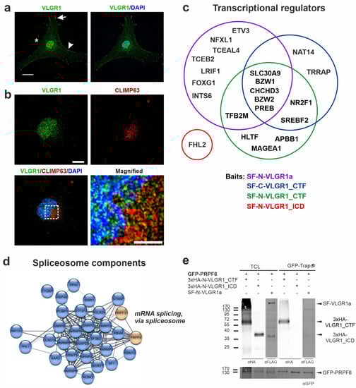 VLGR1 nuclear localization and its interaction with transcriptional regulators and components of the spliceosome. (a) Indirect immunofluorescence of VLGR1 counter stained for the nucleus by DAPI (blue) in astrocytes derived from mouse brains. VLGR1 (green) is localized in the plasma membrane (arrowhead) in the cytoplasm, in focal adhesions (arrow), and in the nucleoplasm of the nucleus (asterisk). (b) Double immunofluorescence of VLGR1 (green) and the ER marker CLIMP63 (red), counter stained for nuclear DNA by DAPI (blue) in HeLa cells demonstrating prominent VLGR1 localization in the ER. (c) Venn diagram of VLGR1 prey with a function in transcriptional regulation (CRAPome value ≤ 20). (d) STRING network of VLGR1 TAP prey assigned to the GO term mRNA splicing, via spliceosome. (e) Validation of the interaction of VLGR1 with the spliceosome component PRPF6. GFP-PRPF6 pulled down VLGR1_CTF in a GFP-Trap® assay. TCL: total cell lysate, CTF: C-terminal fragment, ICD; intracellular domain, SF: Strep II-FLAG. Scale bars in (a,b): 10 µm.