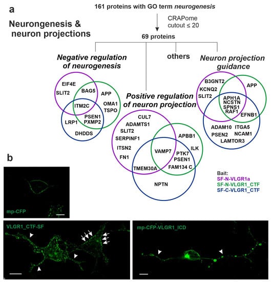 In VLGR1 TAPs we found 161 proteins in total assigned to the GO term neurogenesis, which is in line with the high expression of VLGR1 in the developing brain [2]. These hits were reduced to 69 proteins by filtering against the CRAPome dataset (cutout ≤ 20) (Figure 6a). Fourteen of them were categorized to the GO term neuron projection guidance, which includes the Alzheimer disease-related proteins APP, three subunits of the γ-secretase (NCSTN, PSEN2, APH1A), and Slit guidance ligand 2 (SLIT2) (Figure 6a). SLIT2 acts as a guidance cue for retinal ganglion cells [80,81]. Interestingly, SLIT2 is related to the fibronectin leucine-rich transmembrane protein 3 (FLRT3) [82], a ligand of the ADGR Latrophilin 2 (LPHN2, ADGRL2) [83], which we also identified in VLGR1a TAPs (Supplementary Table S1). The APP-binding protein APBB1 and the protein tyrosine kinase 7 (PTK7), an inactive kinase known to participate in Wnt signaling [84], were categorized to the category positive regulators of neuron projection. In accordance with the role of VLGR1, in the outgrowth of neuron projections is our finding that the overexpression of VLGR1_CTFs and myristoyl-palmitoyl-tagged VLGR1_ICD induces the formation of long “axon-like” cell projections (Figure 6b). Nevertheless, other prey were categorized to negative regulators of neurogenesis, which includes APP, PSEN1, and the integral membrane protein 2C (ITM2C), a regulator of APP [85].
