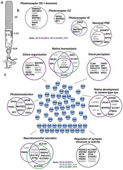 VLGR1 is highly expressed in the neuronal retina of vertebrates, mainly localized to specialized adhesion complexes such as the periciliary membrane complex at the base of the photoreceptor cilium, the retinal ribbon synapses of photoreceptor cells [5,20]. Accordingly, in VLGR1 TAPs we have identified several proteins that are attributed to the Cellular Component GO terms, the photoreceptor outer segment, axoneme, photoreceptor connecting cilium, photoreceptor inner segment, and neuronal postsynaptic density (Figure 7a,b). Among the enriched GO terms in the Biological Process category, we found several terms connected to retinal or ciliary function. These are, for example, cilium organization, visual perception, retina development in the camera-type eye, retina homeostasis, phototransduction, neurotransmitter secretion, and the regulation of the synapse structure or activity (Figure 7c). Data analysis with the cytoscape plugin stringApp (http://apps.cytoscape.org/apps/stringapp, accessed on 10 September 2017) demonstrated that the interconnection of about half of these proteins is supported by STRING data (https://string-db.org/, accessed on 10 September 2017). Notably, TAP prey assigned with GO terms related to the photoreceptor outer segment, connecting cilium, cilium organization, and visual perception were exclusively found in the dataset of the full-length protein VLGR1a. Prey assigned to the inner segment, phototransduction, and retinal development were identified in all three datasets, the full-length VLGR1a and the two VLGR1_CTFs, whereas prey assigned to the neuronal post-synaptic density and regulation of the synaptic structure or activity were mainly found with the VLGR1_CTFs.
