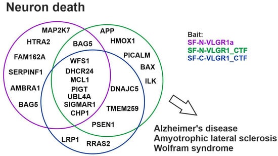 VLGR1 associates with neuron death. VLGR1 prey are associated with neuron integrity. Venn diagram of VLGR1 prey assigned with the GO term neuron death. Some of these proteins are related to neurodegenerative diseases such as Alzheimer’s disease, Amyotrophic lateral sclerosis, and Wolfram syndrome.
