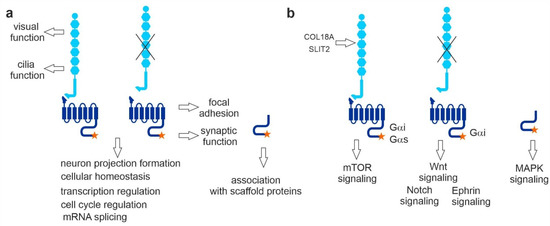 In any case, the active and inactive receptors most probably associate with different protein complexes enrolled in diverse functional modules. Previous analyses of the protein–protein interaction revealed that the cytoplasmic tail of VLGR1 binds through its PDZ-binding motive to the PDZ domains of USH-related scaffold proteins, namely whirlin (USH2D), harmonin (USH1C), and the USH genetic modifier PDZD7 [13]. These interactions also mediate the integration of VLGR1 into the USH-protein networks associated with membrane adhesion complexes. More recently, it became evident that defects in USH molecules lead to dysfunctions in primary cilia, which are regarded as the sensory antennae and signaling hub of the cell [31,32,33,34]. However, nothing is known about VLGR1 signaling in primary cilia [35]. In addition, two studies addressing VLGR1 signaling pathways reported contradictory pathways via Gαs/Gαq and Gαi, respectively [36,37].