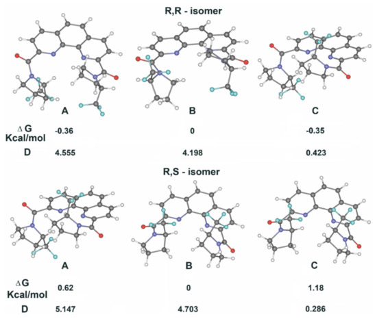 C of both diastereomers are rather complex. There are several very close local minima differing in dihedral angles for Phen–CO bonds (the difference in free energies is ±0.5 kcal/mol) near the global minima. The structures corresponding to the global minima are shown in