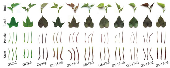 Eleven leafy sweet potato varieties were used in this study. The varieties included GSC-2 and GCS-5 with green aerial parts and Ziyang, GS-15-28, GS-16-11, GS-17-3, GS-17-5, GS-17-10, GS-17-21, GS-17-22, and GS-17-23, which were bred with green-purple aerial parts. Cuttings of all of the 11 sweet potato varieties were planted on 4 August 2019 and grown using standard production practices [48] at the National Germplasm Guangzhou Sweet Potato Nursery, Guangdong Province, China (23°23′ N, 113°26′ E). The soil at the study site is clay loam with a pH of 5.81, organic matter content is 22.9 g kg−1, hydrolysable nitrogen content is 78.1 mg kg−1, available phosphorus content is 35.0 mg kg−1, and available potassium content is 173.0 mg kg−1 within the top 30 cm soil depth. The average monthly temperature of June, July and August is 28.6 °C, 29.8 °C and 30.0 °C, respectively. At 45 days after planting, the apical buds, one to four unfolded leaves (approximately 5.30 cm ×3.65 cm) from the top, and the corresponding petioles and stems were collected separately (Figure 1). Triplicate fresh samples of each part from each variety were immediately frozen in liquid nitrogen. All of the samples were ground using a liquid nitrogen grinder (A10 basic, IKA, Staufen, Germany) and stored at −80 °C until analysis.