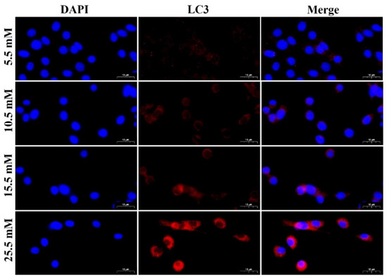 The fluorescence distribution of LC3 in MDBK cells after different concentrations of glucose stimulation. MDBK cells were treated with 5.5, 10.5, 15.5, and 25.5 mM glucose for 24 h, respectively. LC3 was labeled with red fluorescence by Cy3, and the nucleus was labeled with blue fluorescence by DAPI. Scale bar, 10 µm.