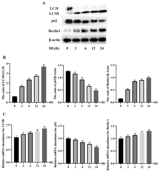 Effects of different treatment times of HG on autophagy in MDBK cells. MDBK cells were treated with 25.5 mM glucose for 0, 3, 6, 12, and 24 h, respectively. Western blot and qRT-PCR were used to assess protein expression, and gene expression, respectively. (A,B) The protein level of LC3-II/I, p62, and Beclin1; (C) The mRNA expression level of LC3B, p62, and Beclin1. ** p < 0.01 compared with control group.