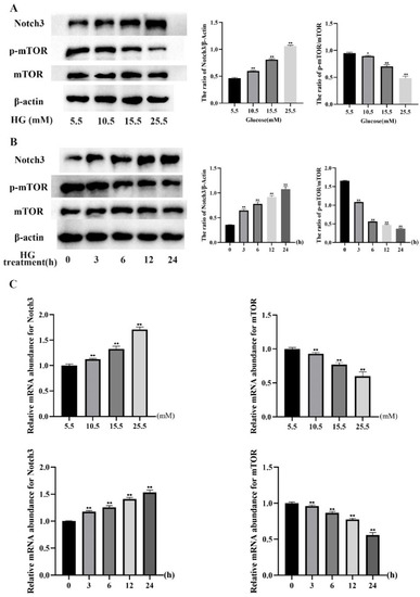 HG induced Notch3 and mTOR signaling pathways in MDBK cells. MDBK cells were treated with 5.5, 10.5, 15.5, and 25.5 mM glucose for 24 h, respectively; MDBK cells were treated with 25.5 mM glucose for 0, 3, 6, 12, and 24 h, respectively. Western blot, and qRT-PCR were used to assess protein expression, and gene expression, respectively. (A,B) The protein level of Notch3, mTOR, and p-mTOR; (C) The mRNA expression level of Notch3 and mTOR. * p < 0.05 and ** p < 0.01 compared with control group.