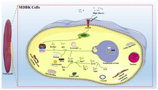 Schematic diagram for the proposed autophagy signaling pathways in MDBK cells regulated by HG. This study provides some theoretical basis for the pathogenesis and treatment of nephropathy induced by hyperglycemia, such as diabetic nephropathy and stress hyperglycemia.